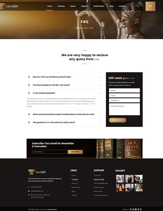 LawSight is a responsive corporate, business & Law services WordPress theme. It is suitable for all types of Law business & corporate websites.